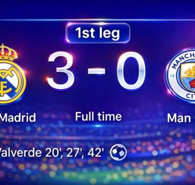 Score final : Real Madrid 3 – 0 Manchester CityLieu : Santiago Bernabéu, MadridCompétition : Huitième de finale aller – …
