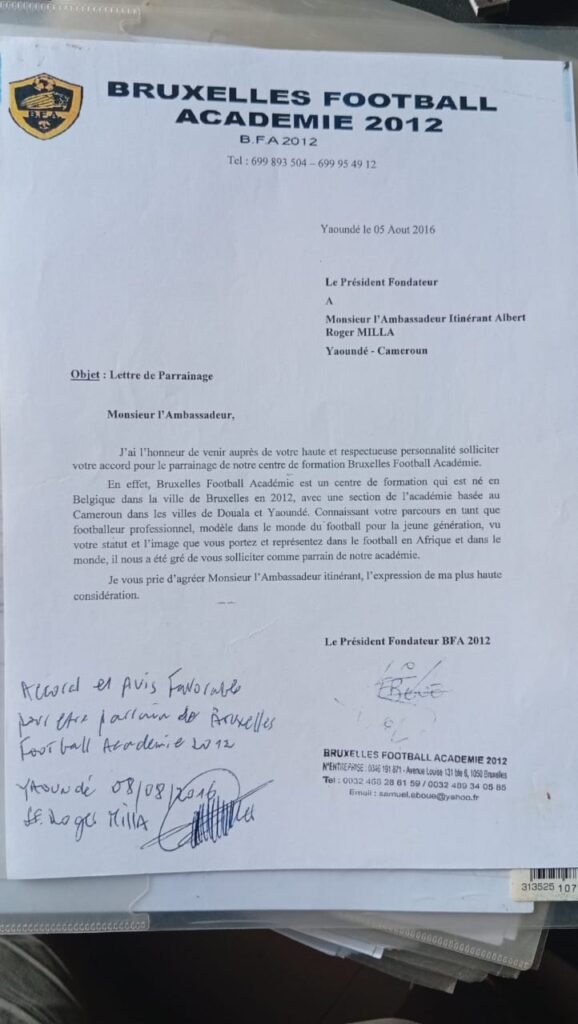 Le 5 août 2016, le président fondateur de l’académie a officiellement sollicité le parrainage de l’ambassadeur itinérant Albert Roger Milla, icône du football camerounais et mondial. Quelques jours plus tard, le 8 août, Roger Milla a donné son accord écrit et signé, acceptant de devenir parrain de l’académie. Ce geste symbolique a renforcé la crédibilité du projet et son rayonnement auprès des jeunes.