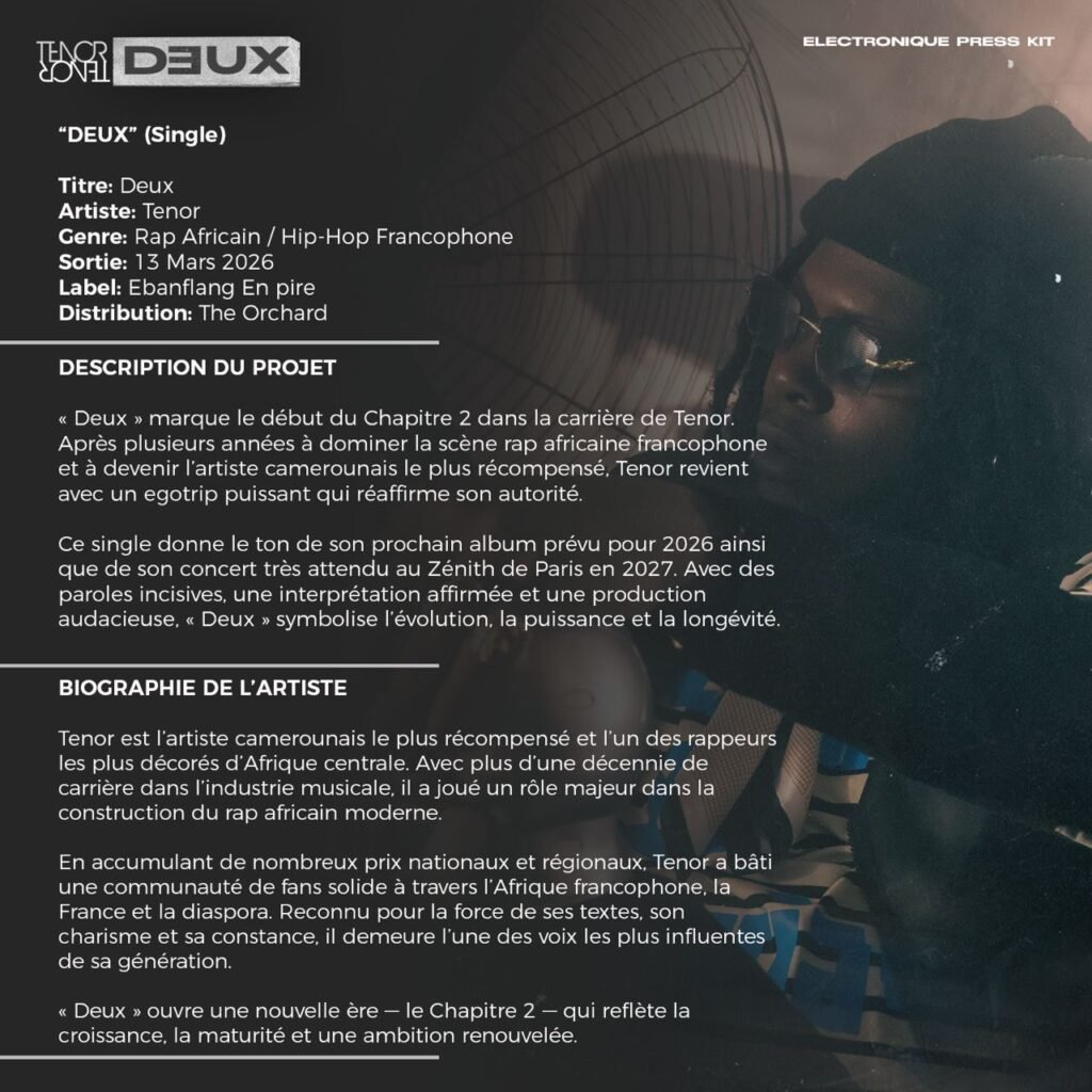 Avec Deux, Tenor signe un morceau incisif qui réaffirme son autorité sur le rap africain francophone. L’ambiance est énergique, motivante, et les paroles traduisent une volonté de domination et de renaissance. Ce single prépare le terrain pour son prochain album prévu en novembre 2026, ainsi qu’un concert événement au Zénith de Paris en 2027.